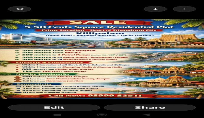Sale - 5.50 cents square residential plot in prime location, heart of Trivandrum city, available for sale in Killipalam, (Bund Road - Kattaikal Junction - Lucky Garden)